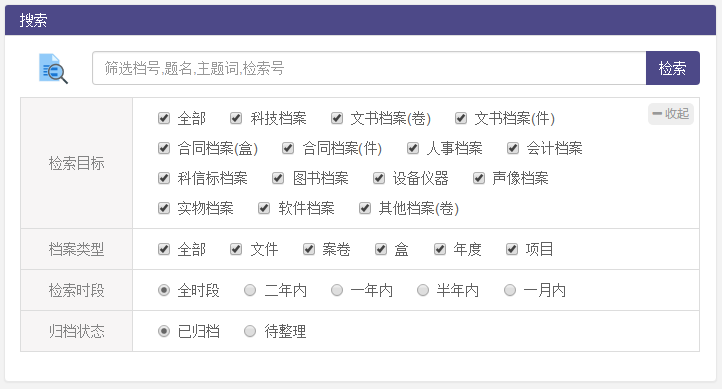 系統(tǒng)擁有非常強大的檢索功能,支持但不限于按照檔案分類篩選、檔案類型、檢索目標、檢索時段、歸檔狀態(tài)以及檔案關鍵字(關鍵字檢索內容包括但不限于檔號、題名、主題詞、檢索號等)、時間、立卷部門、檢查部門、歸檔部門等條件進行檔案信息檢索。同時檢索目標檢索和檔案類型檢索支持多選組合檢索,最大程度上實現(xiàn)了檢索的高度自定義和精確性。