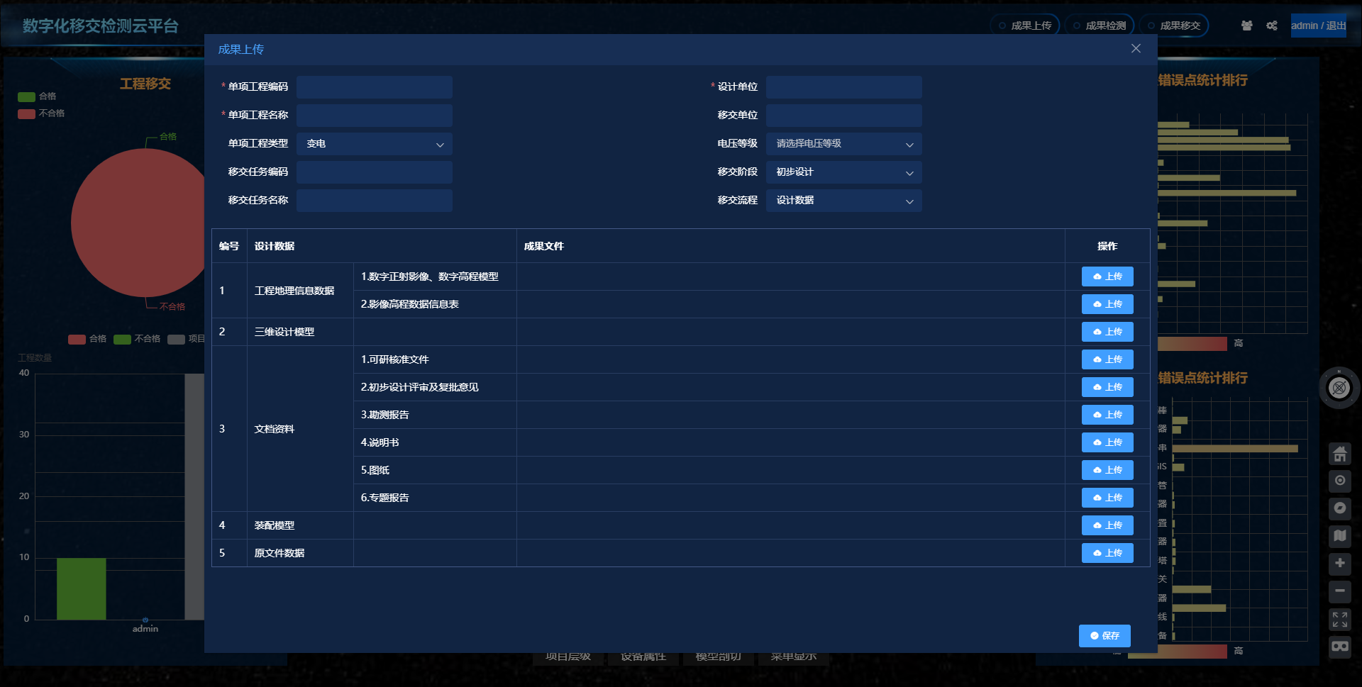 支撐增量展示全省數(shù)字化移交的工程情況,直觀分析移交工作情況,含移交質(zhì)量分類分析,錯誤要點統(tǒng)計排行等。